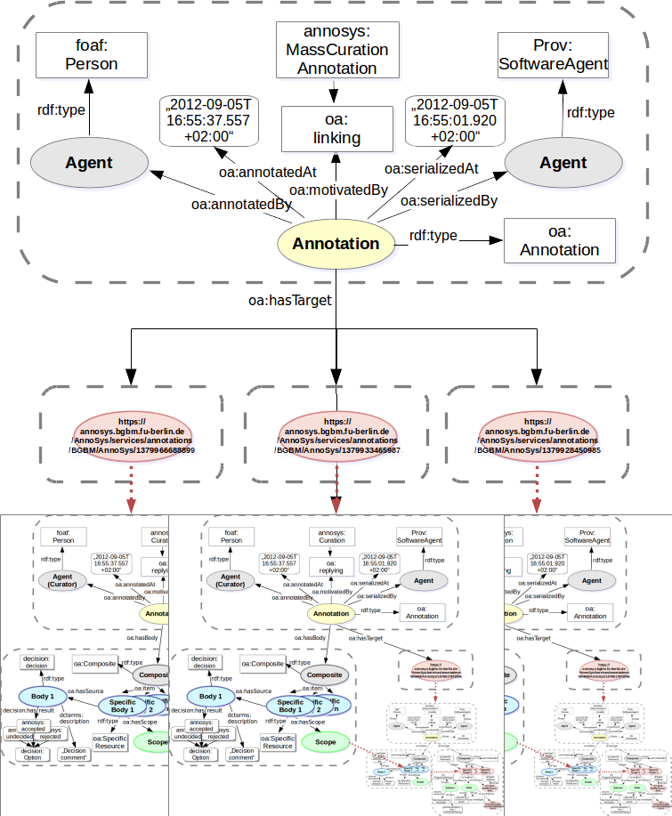 Any of these stable URIs are resolvable, such as either the denoted annotation can be downloaded as RDF/XML document, or the original record as XML document from the AnnoSys repository. That way, the AnnoSys repository and any services are completely following the recommendations of the Linked Open Data paradigm.