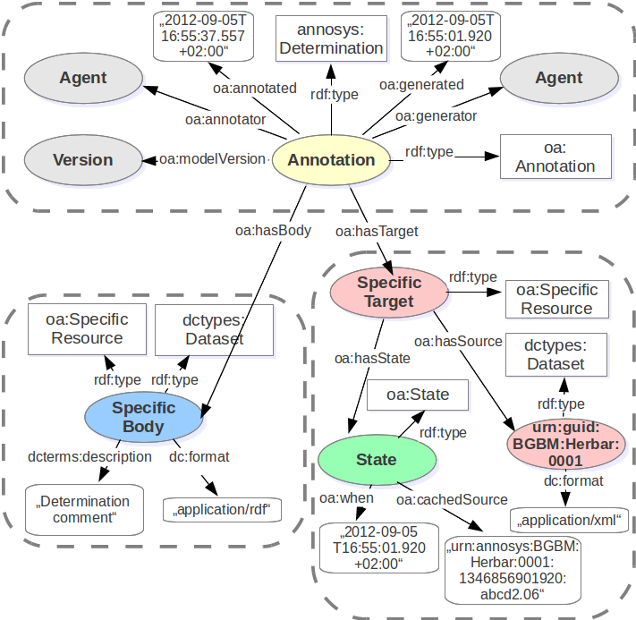 The data model specified within the next sections will mainly be built up on the results evaluated in chapter Annotation context modelling. As such, annotations will be described within the data model by two interrelated parts: